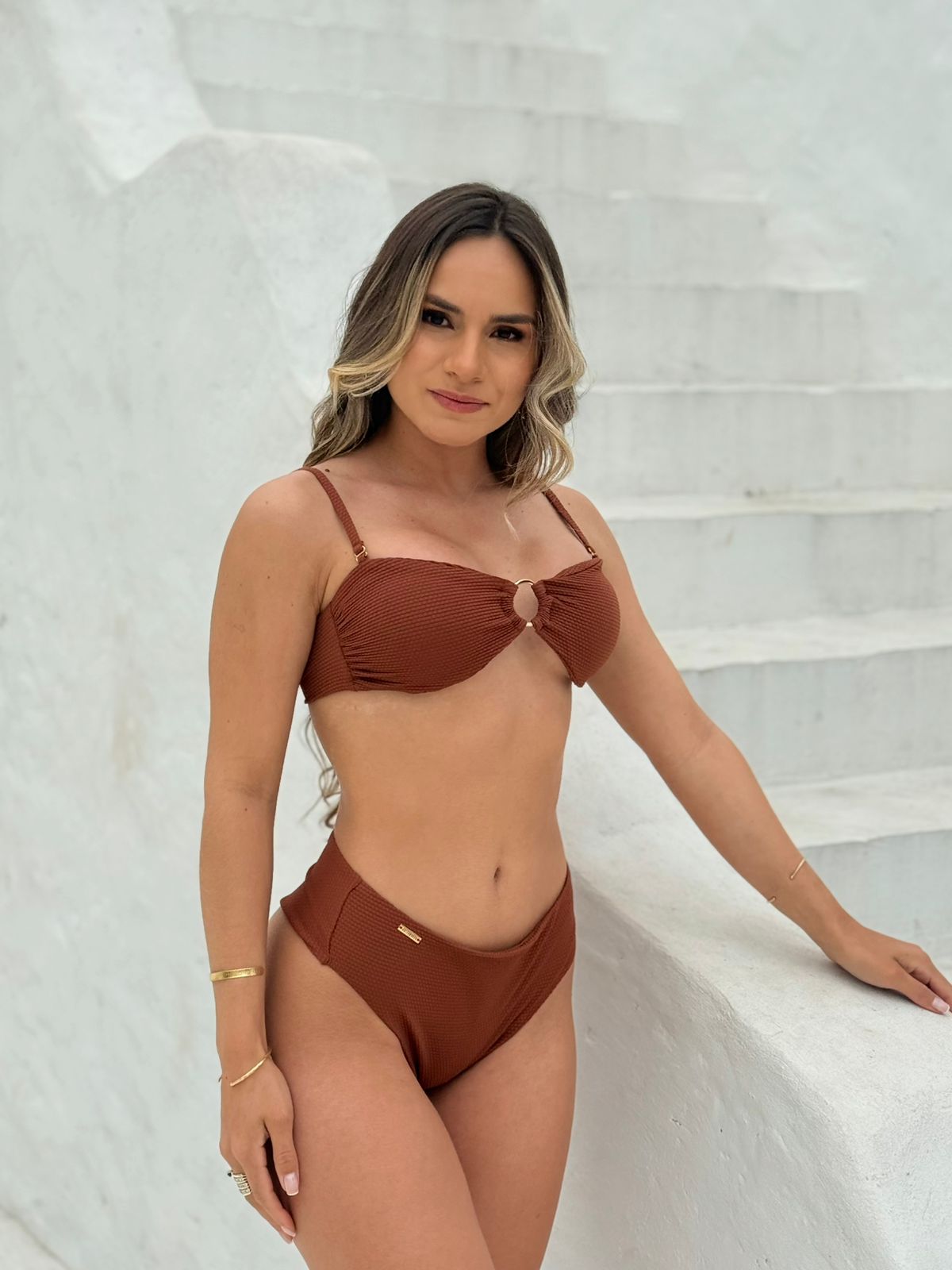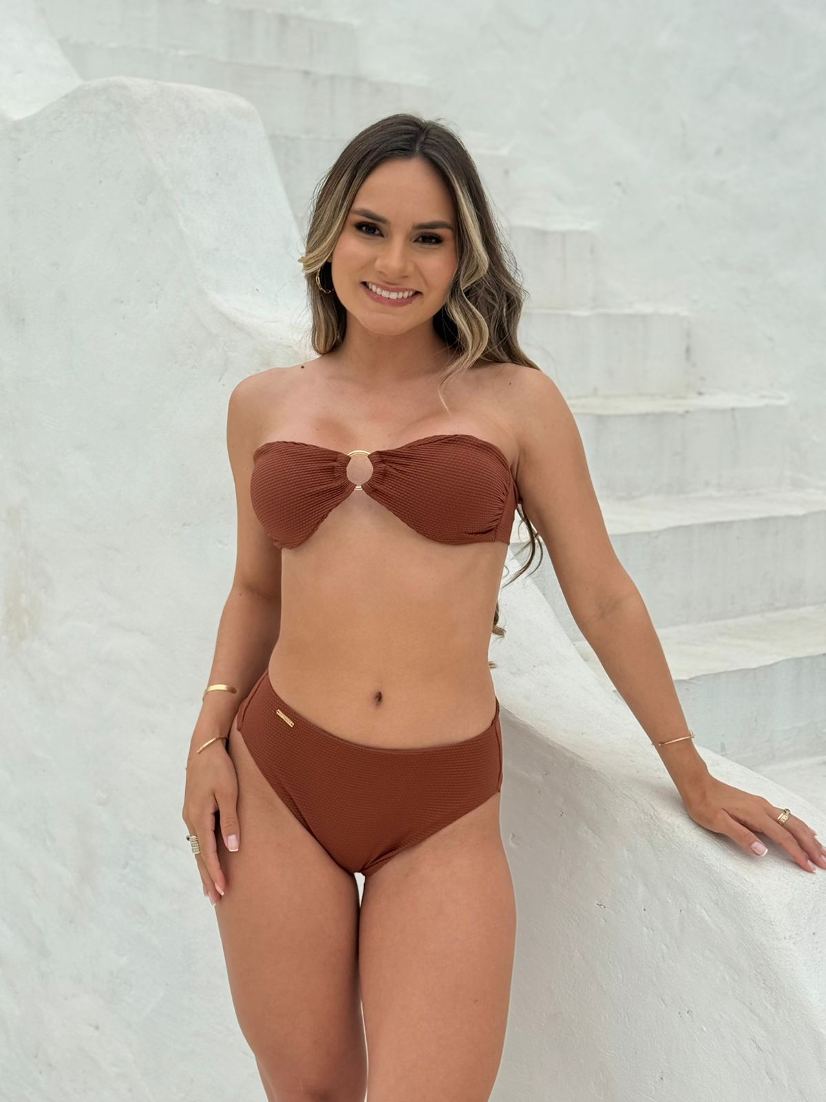 Earthy and sophisticated, the Terracotta High-Waist Ring Bikini highlights natural tones with a modern silhouette. Its bandeau-style top with ring detail adds chic flair.