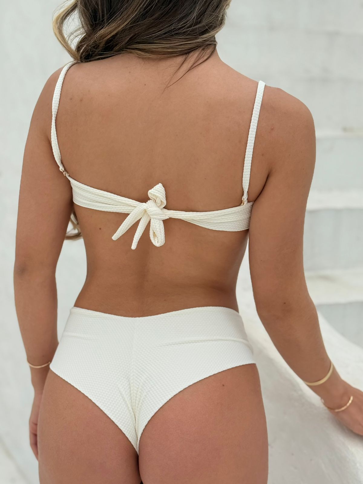 Elegant and versatile, the White High-Waist Ring Bikini combines a bandeau-inspired top with a gold ring detail and high-rise bottoms for extra comfort and sophistication.