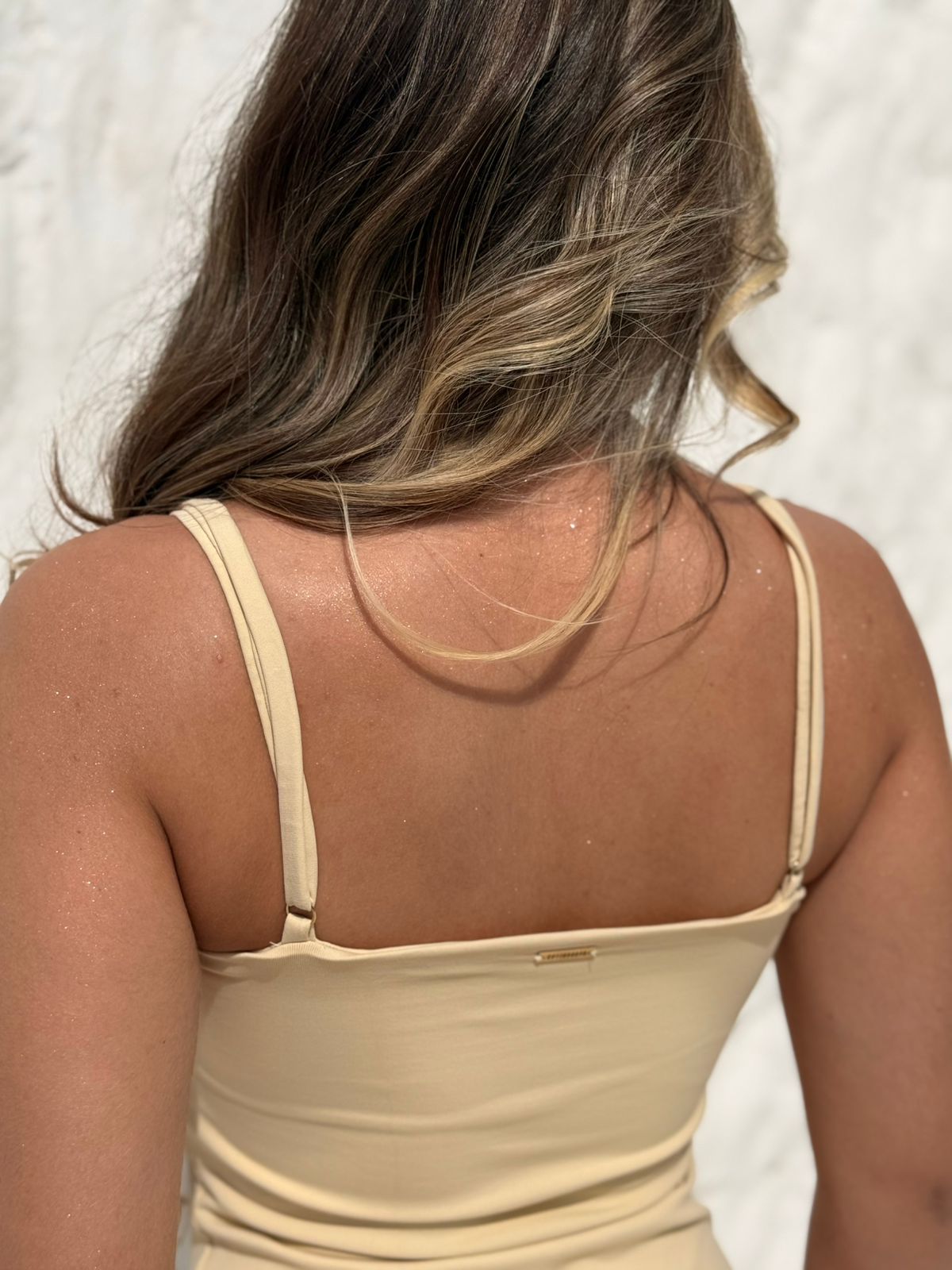 Elegant beige one-piece swimsuit with a minimalist cut and adjustable straps. A chic choice for sunny days and also perfect to style as a body.