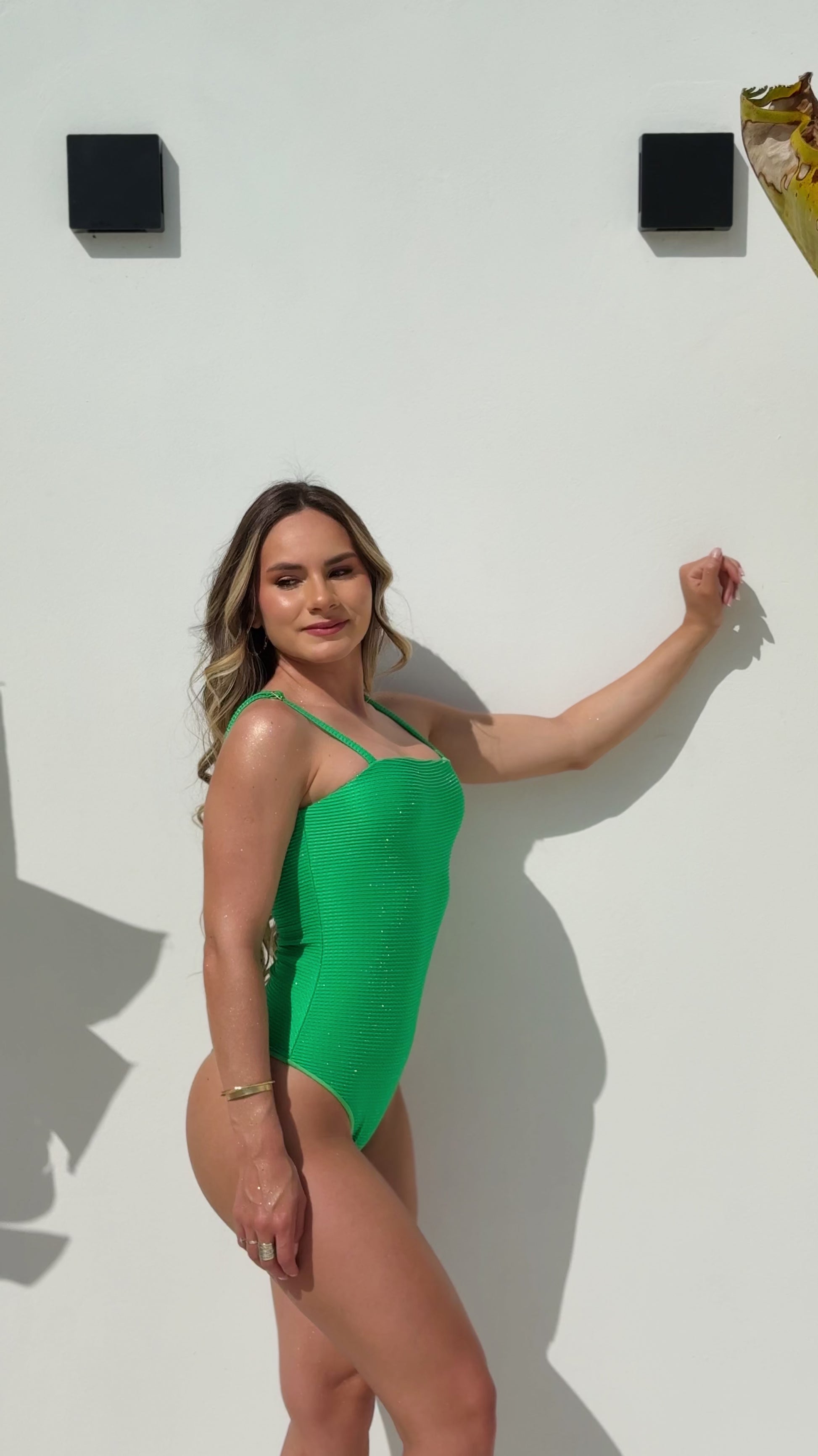 The Green Shimmer One-Piece is fresh and bold. Featuring a straight square neckline, thin adjustable straps, and a flattering high-cut leg, this swimsuit blends modern elegance with comfort for poolside or resort wear.