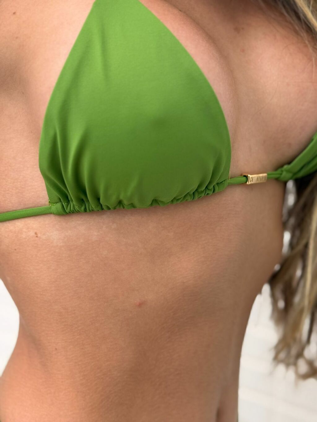 The Green Triangle Bikini is fresh and versatile. Made with textured fabric, a classic triangle top with adjustable straps, and a double-string bottom, this set combines comfort with a flattering fit.